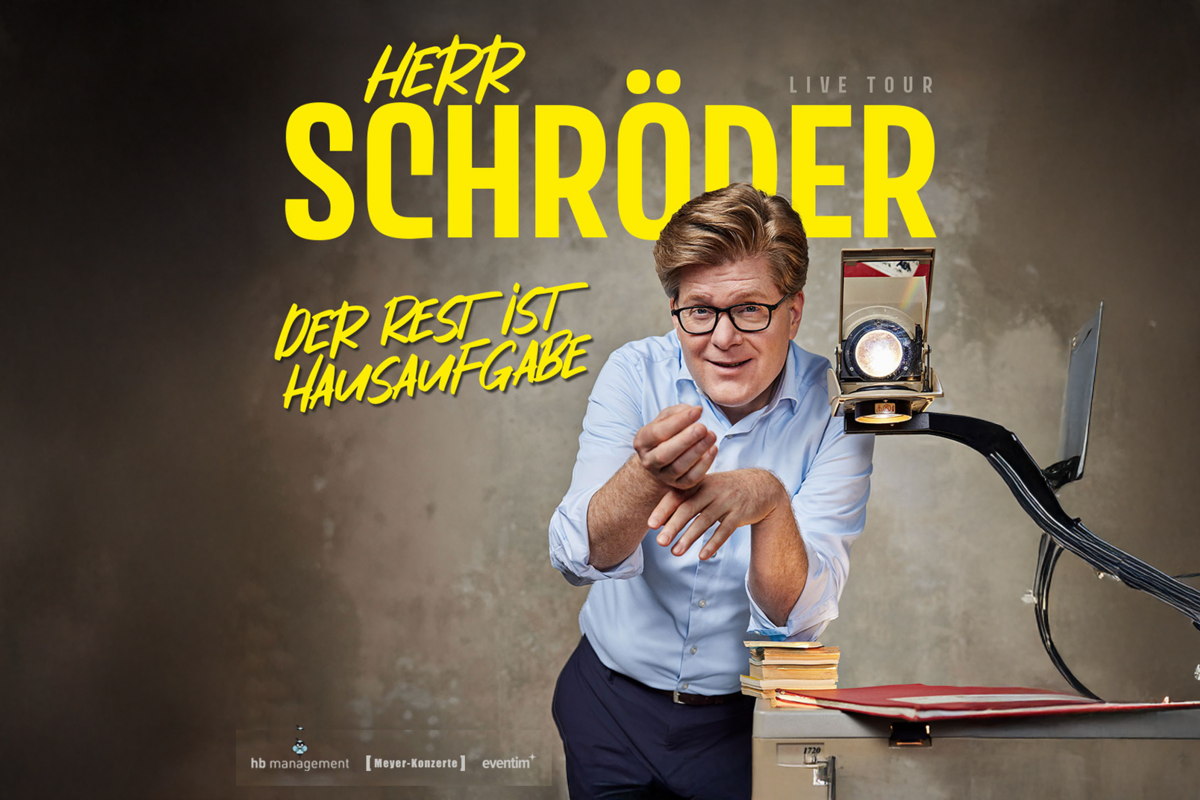 Der Rest ist HausaufgabeHerr Schröder ist wieder da! Endlich ist der staatlich geprüfte Deutschlehrer mit seinem neuen Solo „Der Rest ist Hausaufgabe“ wieder auf Tour. In Aachen läutet die Schulglocke dann am Donnerstag, 16.04, im Eurogress. Herr Schröder, der dienstälteste Junglehrer und Mensch gewordene Overhead-Projektor, präsentiert seine neue Doppelstunde „Der Rest ist Hausaufgabe“. Dabei leuchtet er den Weg in ein besseres Futur II und verleiht uns die Lehrkraft, die wir alle brauchen. Denn Schule heute ist ein Gruppenpuzzle mit 1000 Teilen. Es zu lösen gleicht der Quadratur des Stuhlkreises. Freuen Sie sich auf den Silberstreif am Erwartungshorizont, wenn es heißt: „Tablets raus, einloggen und mitmachen. Auch in der letzten Reihe! Und wenn wir nicht ganz fertig werden: Der Rest ist Hausaufgabe!“